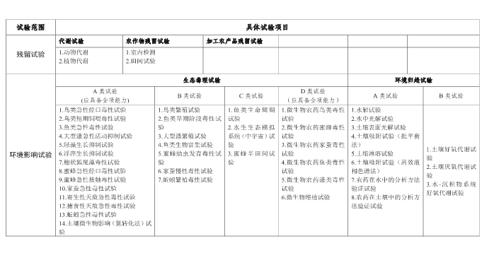 产品化学试验包括(全)组分分析试验、理化性质测定试验、产品质量检测和储存稳定性试验。药效试验分为农林用农药试验和卫生用农药试验等。毒理学试验包括急性毒性试验、重复染毒毒性试验、特殊毒性试验、代谢和毒物动力学试验、微生物致病性试验和暴露量测试试验。残留试验包括代谢试验、农作物残留试验和加工农产品残留试验。环境影响试验包括生态毒理试验和环境归趋试验。