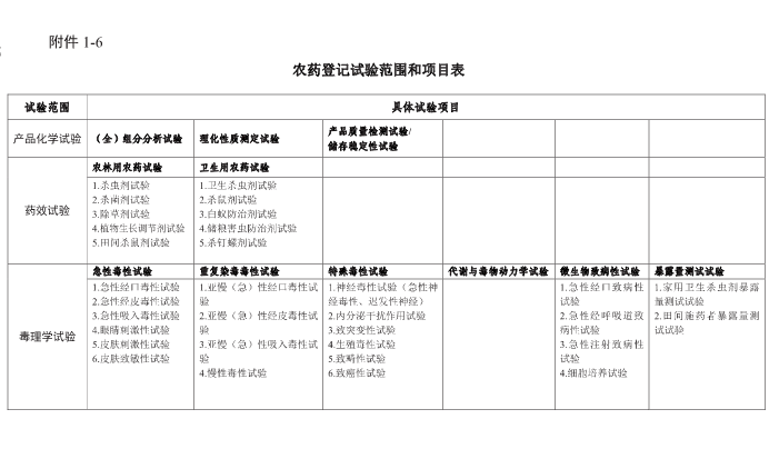 1-6农药登记试验范围和项目表